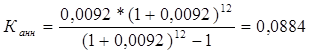 Исходные данные: S = 38 582 тыс. руб. i = 0,92% (11% / 12 мес.) = 0,0092 n =12 (1 год*12 мес.) Подставляем эти значения в формулу и определяем коэффициент аннуитета: