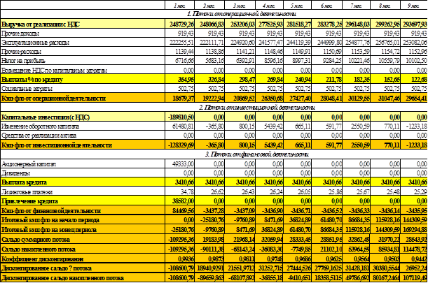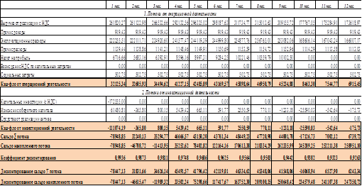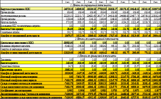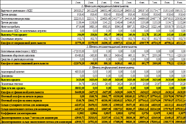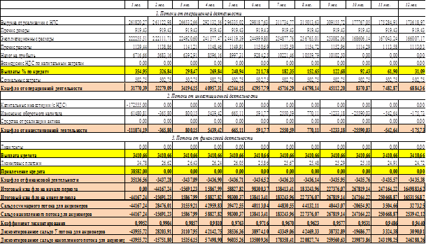 Итоговый кэш-фло на начало периода равен итоговому кэш-фло на конец периода по предыдущему месяцу. В первом месяце итоговый кэш-фло на начало периода равен 0. Итоговый кэш-фло на конец периода рассчитывается как сумма от трех видов деятельности прибавив итоговый кэш-фло на начало периода. Как видно из Отчета о движении денежных средств, кэш-фло на начало периода отрицательный во 2-ом месяце и в конце периода отрицательный в первом месяце, следовательно, проекту требуется дополнительное финансирование. Таблица 22 - Отчет о движении денежных средств (привлечение кредита)
