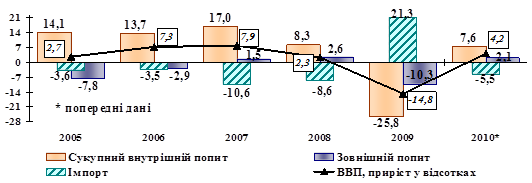 Як бачимо з таблиці, на сьогоднішній день показник дефіциту держбюджету є найвищим починаючи з 2004 року, де він становив 2,9%. Слід зазначити, що ефективність бюджетної політики характеризується низкою показників, таких як: динаміка ВВП і обсягу виробництва, рівень цін, динаміка валютного курсу, рівень зайнятості. На жаль поліпшення цих показників в останні роки не є характерним для України, що говорить про неефективну бюджетну політику уряду. В цілому, в Україні за попередньою оцінкою Держкомстату відбулося зростання ВВП на 4,2 відсотка порівняно з 2009 роком (падіння у 2009 році становило 14,8 відсотка), що видно з рис.2.1 [23]. В цілому у 2010 році в Україні, основною причиною відновлення економічного зростання, крім фактору низької бази, було покращення зовнішньоекономічної кон’юнктури та розширення внутрішнього попиту.