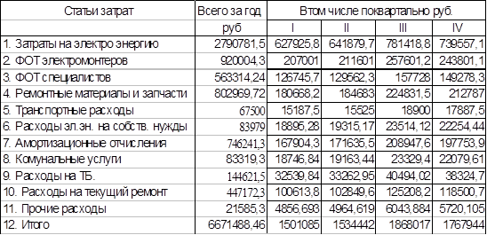 8.6 Прочие затраты Прочие затраты в основном включают расходы по содержанию оборудования и помещений энергохозяйства, износ инвентаря и инструментов, затраты на испытания, анализы и проверки. Величину прочих затрат принимаем в размере 5,5 % от фонда оплаты труда электромонтеров.