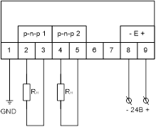 Рис.5 Схема підключення тензодатчика. Для контролю температури в ємності підготовки, куди поступають всі інградієнти слід використати датчик температури з узгоджуючим пристроєм, з котрого вихідний сигнал поступатиме в схему управління. Тому обираю погружний датчик з встроєною оціночною електронікою типу ТС01-G1/2A4P. Даний датчик в своєму наборі має два встроєних p-n-p виходи з програмуємим станом спрацювання (замикання/розмикання) з максимальним струмом навантаження в 200 мА.