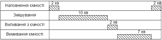 Час роботи двигуна міксера , а саме й весь цикл збивання, буде залежати від потрібної заданної густини масси по закінченні процессу. 2.3 Перелік вхідних та вихідних елементів Вхідні елементи: SB1- відключення схеми (СТОП); SB2 - включення схеми управління; SB3 – вибір режиму роботи; SB4 – попередній контроль роботи; SB5 – запуск процессу дозування KU - контакт реле обриву фаз; QF1 - контакт несправності двигуна збивання; QF2 - контакт несправності гідро двигуна подачі води обмиву; QF3 - контакт несправності двигуна маслостанції; VD1…9 – сигналізація роботи обладнання Вихідні елементи: PIC - Мікроконтроллер VS1-VS3 – комутуючі пристрої двигуна збивання; VS4-VS6 – комутуючі пристрої двигуна подачі води обмиву; VS7-VS9 – комутуючі пристрої двигуна маслостанції; YA1 – електромагніт наклону ємності; YA2 – електромагніт початкового положення ємності; YA3 – електромагніт подачі води у ємність; YA4 – електромагніт опускання двигуна міксера; YA5 – електромагніт підйому двигуна міксера; 2,4 Циклограма вхідних та вихідних елементів