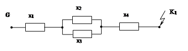 Рис. 3.2 Схема замещения Определим сопротивления приведенные к базисным условиям Сопротивление системы: x1 = xc Сопротивление трансформаторов ГПП x2 = x3 = Сопротивление кабельной линии x4 = x0 ּ l ּ где x0 = 0,08 Ом/км принято для кабельных линий напряжением 6÷20кВ Определим результирующее индуктивное сопротивление цепи КЗ: xрез = Для кабельной линии определяем активную составляющую сопротивления: