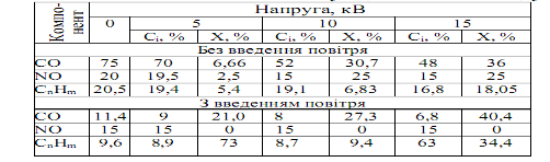 Рисунок 4.1.2.4− Залежність ступеню очистки від напруги для ходу під навантаженням із введенням повітря За цими даними можна зробити висновок, що цим методом можна очистити гази, що відходять від автотранспорту. Електрокаталітичний метод не знижує потужності двигуна, а на деяких режимах навіть підвищує її.(таблиця 2.1.2.4) Таблиця 2.1.2.4 − Дані експериментів по нейтралізації токсичних сполук для холостого ходу
