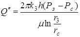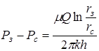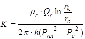 де h — товщина пласта; Рпл — пластовий тиск на контурі живлення; Рс — тиск на стінки свердловини (привибійний тиск); rk — радіус контура живлення свердловини; rc — радіус. Величину