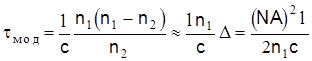 Различные виды дисперсии проявляются по-разному в различных типах волоконных световодов. В ступенчатых многомодовых оптических волокнах доминирует межмодовая дисперсия, которая рассчитывается по формуле: