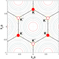 Кристаллическая структура материала находит отражение во всех его физических свойствах. В особенности сильно от порядка, в котором расположены атомы в кристаллической решётке, зависит зонная структура кристалла. Зонная структура графена рассчитана в статье[1]в приближении сильно связанных электронов. На внешней оболочке атома углерода находится 4 электрона, три из которых образуют связи с соседними атомами в решётки при перекрыванииsp ²-гибридизированныхорбиталей, а оставшийся электрон находится в 2pz -состоянии (именно это состояние отвечает вграфитеза образование межплоскостных связей, а в графене — за образование энергетических зон). Вприближении сильно связанных электроновполнаяволновая функциявсех электронов кристалла записывается в виде суммы волновых функций электронов из разных подрешёток