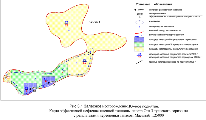 К категории С1 (оцененные) относятся неразбуренные, промышленно значимые извлекаемые запасы частей залежи, примыкающих к запасам более высоких категорий (А, В), и в районе скважин с положительной характеристикой по ГИС, но не опробованных в колонне, при условии подтверждения выдержанности пласта в исследуемой части залежи; К категории С2 ( предполагаемые) относятся предполагаемые неразбуренные, экономически эффективные извлекаемые запасы выделяемые между границей запасов категории С1 и границей залежи, а также в пластах с недоказанной продуктивностью, но изученных по материалам геофизических исследований в транзитных эксплуатационных скважинах и в неразбуренных тектонических блоках на залежах с установленной продуктивностью. Продуктивными на Залесном месторождении являются отложения тульского горизонта нижнего карбона. В пределах месторождения выделены две залежи пласта Стл-3. В рамках оперативного подсчета запасов /6,7/ не рассмотрено вариантов разработки залежей тульского горизонта. Хотя на месторождении ведется добыча нефти, каких либо данных о вариантах разработки Залесного месторождения нет. Для выбора технологических показателей разработки залежей тульского горизонта рассмотрено соседнее месторождение - Чудное /8/. По аналогии принят вариант, который предусматривает разбуривание залежей вертикальными скважинами с расстоянием между скважинами 400 м. Шаг сетки разбуривания скважин принят 400х400 метров, коэффициент извлечения нефти – 0.361. Согласно инструкции /3/ для переоценки категорий на залежи был принят элементарный участок – квадрат со стороной 400 метров, ориентированный по линии север-юг. Совокупность смежных квадратов определяет границы участков запасов разных категорий. На Залесном месторождении выделены запасы категорий В (установленные), С1 (оцененные) и С2 (предполагаемые). Залежь 1 пласта Стл-3 (Южное поднятие). Залежь вскрыта двумя скважинами №20005 и №286. Согласно подсчету запасов 2008 года /4,6 / запасы залежи по степени геологической изученности отнесены к категории С1 и С2, и ограничены внешним контуром нефтеносности. Шаг сетки разбуривания скважины принят 400х400 метров, коэффициент извлечения нефти – 0.361. Согласно инструкции /3/ для переоценки категорий на залежи был принят элементарный участок – квадрат со стороной 400 метров, ориентированный по линии север-юг. Совокупность смежных квадратов определяет границы участков запасов разных категорий. На данной залежи выделены запасы категорий В (установленные), С1 (оцененные) и С2 (предполагаемые) (рис. 3.1.). Запасы категории В в пределах залежи выделены вокруг скважин № 20005 и № 286, граница проведена по квадратному элементу со стороной 400 метров (рис.). Основанием для выделения запасов категории В является наличие промышленного притока нефти при опробовании в колонне. При опробовании в колонне скважины № 20005 из пласта Стл-3 получен промышленный приток безводной нефти дебитом 2,7 м Запасы категории С1 выделены вокруг квадрата категории В в районе скважин № 20005 и № 286 по периметру шириной 400 м (рис.). Граница категории С1 ограничена контуром залежи на юге и севере. Запасы категории С1 находятся на неразбуренной части залежи, но непосредственно примыкают к участкам запасов высшей категории (В) и геолого-геофизическая информация доказывает непрерывность пласта в сто