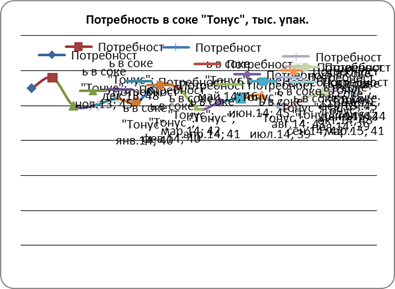 Перед началом расчетов начертим график зависимости продаж сока «Тонус» от времени, по имеющимся данным. Исходя из графика видно, что сок «Тонус» относится к регулярно потребляемым товарам. Поэтому для прогнозирования спроса будем использовать методы стохастического расчета, а именно простую скользящую среднюю, взвешенную скользящую среднюю, регрессионный анализ и метод доверительного интервала. После этого сравним средние отклонения и выберем наиболее точный метод прогнозирования.