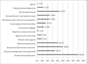 Как и в вопросе относительно причин получения высшего образования, так и в вопросе о критериях выбора ВУЗа мнение молодых людей и девушек было достаточно однородным. Однако важно отметить, что 27 девушек одним из немаловажных критериев отметили изучение более 1 иностранного языка, в то время как молодые люди отметили другой критерий: наличие хорошей технической базы у ВУЗа (19 человек) и, конечно же, наличие военной кафедры (20 человек). Представим обобщенные данные в виде диаграммы (рис. 9). Рис.9 Дифференциация критериев выбора абитуриентами ВУЗа
