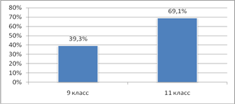 80% респондентов важнейшим критерием назвали наличие интересной им специальности в ВУЗе, далее идет возможность бесплатного обучения (50%) и наличие у ВУЗа аккредитации (43,3%). Немаловажным критерием было названо также местонахождение ВУЗа (40,7%). Как выяснилось, абитуриенты отдают предпочтение объективным критериям (специальность, местонахождение, аккредитация, бесплатное обучение, квалификация преподавателей), нежели субъективным (мнение друзей – 9,3%, родители учились в этом ВУЗе – 2,7%, друзья учатся в этом ВУЗе – 8,7%). Среди 150 опрошенных 56 человек – учащиеся 9 класса и 94 человека – 11 класса. Только 39,3% девятиклассников и 69,1% одиннадцатиклассников определились с выбором ВУЗа (рис. 10). Рис.10 Процент респондентов, определившихся с выбором ВУЗа