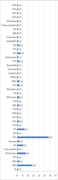 Рассмотрим какие же ВУЗы выбрали респонденты (рис. 11). Таким образом, наибольшее количество респондентов 28,7% планируют поступать в Московский институт электронной техники (МГИЭТ). Такой результат был достаточно предсказуем: МИЭТ соответствует всем критериям, которые были отмечены респондентами (местонахождение, наличие аккредитации, возможность бесплатного обучения). Рис.11 Рейтинг ВУЗов, в которые планируют поступать респонденты
