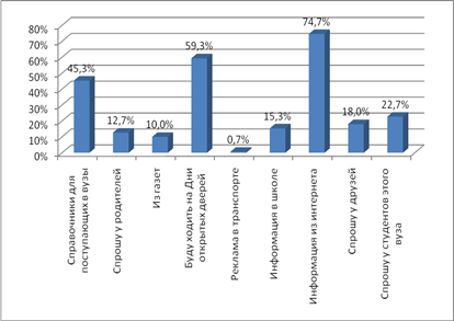 Представленная таблица свидетельствует о том, что мнение работодателей отличается от старшекурсников и преподавателей. Это следует учитывать, в первую очередь абитуриентам при выборе вуза, причем желательно ознакомиться не только с общим рейтингом вузов, но и по направлениям, с учетом конкретной избранной специальности. МГУ им.Ломоносова называют лидером в подготовке специалистов по маркетингу, рекламе и PR, а также HR-менеджеров (специалистов по работе с персоналом). В других сферах (финансах, банковском деле, менеджменте, юриспруденции) он уверенно занимает 2-3 места по популярности. МГУ находится на вершине популярности не только потому, что уровень образования действительно на высоком уровне. Помимо этого в тенденции восприятия «первый – лучший». МГУ знают все, да и готовит университет специалистов в абсолютно разных областях, зачастую, будучи первым ВУЗом, начинающим подготовку специалистов в совершенно новом направлении. Однако если рассмотреть вузы по сферам, окажется, что далеко не везде МГУ занимает первые позиции. Напротив, в лидеры выбиваются не многопрофильные институты, а четко позиционирующие себя на рынке по одному из направлений: Российская экономическая академия им. Г. В. Плеханова – ведущий вуз в подготовке экономистов, Государственный университет управления специализируется на выпуске менеджеров для всех отраслей, МГТУ им. Н.Э. Баумана лидирует в подготовке IT-специалистов, Финансовая академия при Правительстве РФ – «финансистов», МГЮА – юристов и т. д. 1.5 Роль источников информации при выборе высшего учебного заведения В Белгородской государственной академии строительных материалов в рамках социологических исследований «Абитуриент БелГТАСМ–2001» было проведено исследование, целью которого являлось определение степени информационной обеспеченности абитуриентов. Сведения о БелГТАСМ иногородние абитуриенты получили: 26% — от студентов нашей академии, 18% — узнали об академии в своей школе, 17% — от представителей нашей академии, 17% — участвовали в «Дне открытых дверей», 14% — узнали из справочника вузов. Что касается школьников 11-х классов, то каналы получения сведений об академии выглядят следующим образом: 67% — получило их от родителей и знакомых, 35% — узнало из рекламы в СМИ, 27% — узнали о БелГТАСМ от работников академии и 17% — на подготовительных курсах академии. Ввиду того, что многие респонденты в качестве источников указали на несколько факторов выбора, то сумма ответов превысила 100%. Образовательный портал «ВСЕВЕД», на проходившей в ноябре 2005 г. Международной Выставке «Образование и Карьера XXI» задал следующий вопрос абитуриентам: «Какими источниками пользуются в основном будущие абитуриенты?». Выяснилось, что 29% ответивших посещают выставки, но здесь стоит отметить, что такой результат предсказуем, поскольку, на выставку случайно не попадают, как правило, именно большая часть аудитории, целенаправленно посещает выставки. Важно заметить стремительно растущую популярность всемирной паутины. 19% - а это не мало, ищут ВУЗ через Интернет, 18% опрошенных прислушиваются к рекомендациям друзей, родителей и знакомых и пользуются специализированными справочниками и, наконец, 15% используют специализированные издания (газеты и журналы образовательной тематики). В 2005-2006гпроектом EXAMEN было выявлено, что п