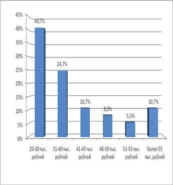Однако 14,7% и 13,3% респондентов хотят получать знания в области информатики и инженерии соответственно, что является положительной тенденцией на сегодняшний момент, т.к. именно в этих областях чувствуется недостаток квалифицированных кадров. Эти данные подтверждают полученную информацию о выбранных ВУЗах: МИЭТ и МГАДА как раз имеют все перечисленные специальности. Относительно ожиданий по заработной плате в течение 1-2 лет после окончания ВУЗа мнения респондентов распределились следующим образом (рис. 18). Рис.18 Ожидания респондентов относительно заработной платы