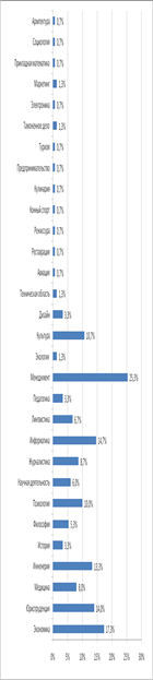 По результатам проведенного исследования и расчетов статистических показателей были получены следующие выводы: - мнение друзей скорее не влияет на принимаемое решение. Причем мнение респондентов по этому вопросу оказалось максимально однородным (КВ-0,029) - респонденты полагаются по большей части только на свое собственное мнение (73,3%). Среднее значение – 1,58, а вот мнение было достаточно неоднородным КВ=0,122. - мнение родителей скорее влияет на абитуриентов (35,3%), чем нет (КВ=0,089). - мнение других родственников абсолютно не влияет на принимаемое решение (36,7%), хотя мнение респондентов было достаточно разрозненным (КВ=0,096). - мнение респондентов относительно степени влияния мнения студентов данного ВУЗа разделились: 26,7% сказали, что оно скорее влияет и 26% - что абсолютно не влияет (КВ=0,088). - относительно степени влияния информации из интернета мнения респондентов также разделились: 29,3% сказали, что она скорее влияет и 28% - затруднились ответить. - как показало исследование, информация из газет абсолютно не влияет на принимаемое абитуриентами решение (41,3%), хотя мнение было достаточно разрозненным (КВ=0,097). - информация из справочников, по мнению респондентов, скорее влияет на их решение (28%). Рассмотрим теперь, какие области знаний выбрали респонденты (рис. 17). Четверть респондентов выбрали такую область знаний, как менеджмент (25,3%). Далее следует экономика – 17,3% и юриспруденция – 14%. Вот уже на протяжении нескольких лет данные области выбирает большинство абитуриентов, считая их наиболее прибыльными, престижными и востребованными. Даже призывы в СМИ, что в настоящее время производство остро нуждается в специалистах технических областей, строителях, малярах и т.п. не оказывает влияния на абитуриентов. Скорее всего, это связано с тем, что респонденты считают эти специальности низкооплачиваемыми. Потому они все еще делают свой выбор в пользу экономики, менеджмента и юриспруденции. образование услуга рынок мотивация Рис.17 Рейтинг областей знаний, выбранных респондентами