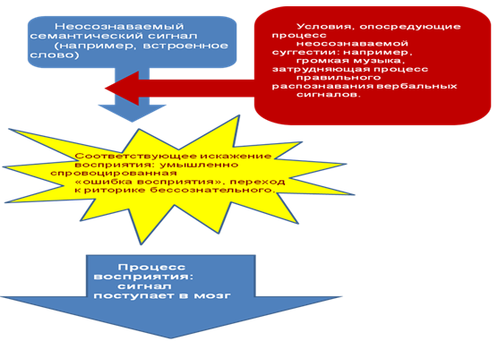 В зависимости от имеющихся когнитивных структур, разные люди воспринимают одни и те же сигналы совершенно по-разному. Считаю правомерным интерполировать этот принцип на процесс восприятия неосознаваемых стимулов. Тем более, об этом же пишет Смирнов: «Любые воспринятые стимулы хранятся в памяти не в форме независимого семантического элемента, а лишь в совокупности ассоциативных связей с другими элементами». Глава 6. Процесс воздействий на психику неосознаваемой суггестии.