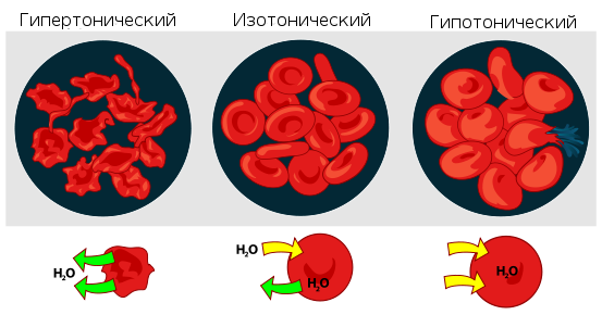 Принципиальная схема осмометра: А — камера для раствора; Б — камера для растворителя; М — мембрана. Уровни жидкости в трубках при осмотическом равновесии: а и б — в условиях равенства внешних давлений в камерах А и Б, когда rА = rБ, при этом Н — столб жидкости, уравновешивающий осмотическое давление; б — в условиях неравенства внешних давлений, когда rА — rБ = p. Осмометры давления параЭтот тип приборов отличается тем, что для измерения требуется минимальный объем пробы (единицы микролитров), что имеет большое значение, когда из объекта исследования нельзя взять больший объем. Однако по причине малости объема пробы осмометры давления пара имеют большую погрешность по сравнению с другими. Кроме того, результат измерения зависит от изменения атмосферного давления. Основное применение эти приборы нашли в научных исследованиях и педиатрической практике для исследований крови новорожденных, взятой из пальчика или пяточки. Диапазон измеряемых концентраций ограничивается 2000 ммоль/кг Н2О. В российских ЛПУ они не нашли широкого применения. В Европейском союзе осмометры давления пара производит фирма Dr .Knauer, Gonotec (Германия), в США - фирма Wescor . Мембранные осмометрыНа свойстве осмоса строятся осмометры, называемые мембранными. В их конструкции могут использоваться как искусственные мембраны (например, целлофан), так и природные (например, кожа лягушки). Приборы этого типа используются для измерения так называемого коллоидно-осмотического давления крови (КОД), которое создается высокомолекулярной (более 30000 Д) составляющей общей концентрации осмотически активных частиц, содержащихся в плазме крови. Это давление называется также онкотическим и создается преимущественно белками. КОД составляет менее 3 ммоль/кг Н2О и поэтому незначительно влияет на общее осмотическое давление, но имеет определяющее значение для процессов транскапиллярного обмена. Эта составляющая общего давления имеет важное диагностическое значение. Мембранные осмометры производят фирмы Dr. Knauer , Gonotec , Германия (Osmomat 050), в США - фирма Wescor. Интересно, что фирма доктора Кнауэра предлагает всю линейку осмометров, перекрывая, таким образом, весь диапазон частиц с молекулярной массой, включая миллионные. Приборы этого типа в России не производятся. Осмометры по точке замерзания (криоскопические) Осмометры, принцип действия которых основан на измерении понижения (депрессии) температуры замерзания раствора в сравнении с температурой замерзания растворителя (в нашем случае воды), нашли наибольшее распространение по причине наилучшей пригодности этой методики для лабораторной клинической диагностики нарушений водного и электролитного баланса (молекулярные массы частиц биологических жидкостей не превышают 30000 Д). Глава 4. Биологическая роль осмоса и осмотического давления осмос давление раствор Осмос играет важную роль во многих биологических процессах. Мембрана, окружающая нормальную клетку крови, проницаема лишь для молекул воды, кислорода, некоторых из растворенных в крови питательных веществ и продуктов клеточной жизнедеятельности; для больших белковых молекул, находящихся в растворенном состоянии внутри клетки, она непроницаема. Поэтому белки, столь важные для биологических процессов, остаются внутри клетки. Осмос участвует в переносе питательных веществ в с