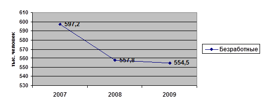 Рисунок 1 Численность безработного населения в Казахстане в 2007-2009 годы Проведенный анализ структуры безработного населения по возрасту и полу показал, что наибольший удельный вес среди безработных занимает молодежь в возрасте 25-29 лет, причем женщин, безработных в этом возрасте, намного больше, чем мужчин (таблица 1). Так в 2007 году было зарегистрировано 25-29 летних безработных женщин 71,7 тыс. человек, а безработных мужчин этого возраста было 48,1 тыс. человек, в 2008 году эти показатели составляли 64,4 тыс. женщин и 48,3 тыс. мужчин, 2009 году – 69,5 тыс. женщин и 59,8 тыс. мужчин. Таблица 1 Безработное население по возрастным группам и полу тысяч человек