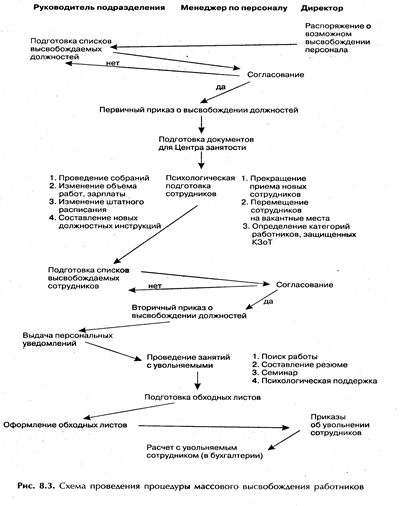 Выплата подобий по безработице прекращается в случаях: - постоянного трудоустройства, - прохождения профессиональной подготовки, повышения квалификации или переподготовки по направлению службы занятости с соответствующей выплатой стипендии, - истечения установленного периода выплаты пособия, - получения пособия обманным путем, - осуждения лица, получающего пособие, к наказанию в виде лишения свободы или принудительного лечения по решению суда, - назначения пенсии (кроме пенсии по инвалидности). Выплата пособий по безработице приостанавливается в случаях: - временного трудоустройства (договор подряда и т. д.), - получения разовых гонораров (в том числе авторских). В настоящее время Служба занятости поддерживает тесную связь с налоговой инспекцией. Ответственные лица Службы занятости передают данные обо всех зарегистрированных безработных, получающих пособие по безработице, в налоговую инспекцию. В свою очередь, налоговая инспекция возвращает информацию в Службу занятости о возможном временном трудоустройстве зарегистрированных безработных. Если безработный своевременно не проинформировал Службу занятости о полученном доходе, то он может понести как материальную, так и административную ответственность. Выплата пособия по безработице может быть отложена на срок до трех месяцев в случаях: - отказа в период безработицы от двух вариантов подходящей работы, - увольнения за нарушение трудовой дисциплины и другие виновные действия, предусмотренные законодательством РФ, - длительного (более одного месяца) отсутствия безработного в месте постоянного проживания без уведомления центра занятости и так далее. Размеры пособий по безработице дифференцируются в зависимости от категорий граждан, признанных безработными. Варианты высвобождения персонала с ориентацией на социальную эффективность, минимизацию социально-психологических издержек, избегание конфликтов выработаны в Германии: Решения по сокращению персонала должны быть убедительными, чтобы не допускать возникновения слухов и недоброжелательности, а также чтобы в каждой конкретной ситуации находились компромиссные решения (например, избежание увольнения до тех пор, пока применимы другие варианты, такие, как прекращение найма, досрочный выход на пенсию с выплатой соответствующей компенсации и т. п.). Варианты высвобождения персонала: 1. Прекращение найма. 2. Перемещения. 3. Сокращение регулярной продолжительности рабочего дня, в том числе за счет: а) отмены (уменьшения) сверхурочных, б) введения сокращенного рабочего дня и активизации использования договоров о занятости неполный рабочий день. 4. Прекращение выдачи на сторону заказов, которые предприятие может выполнить собственными силами. 5. Введение укороченной рабочей недели. 6. Другие отдельные мероприятия: а)денежные компенсации при добровольном уходе с фирмы, б) досрочный выход на пенсию, в) метод «аутплэйсмент» (организация активно старается эмоционально облегчить сотруднику процесс разрыва с ней и помочь в поиске нового места работы путем выдачи рекомендаций, разрешения пользоваться фирменными компьютерами, факсами и телефонами для поиска работы и т. п.), увольнение отдельных сотрудников по признаку большей нерадивости, меньшей отдачи для фирмы. 7. Массовые увольнения. Ориентированная на баланс интере