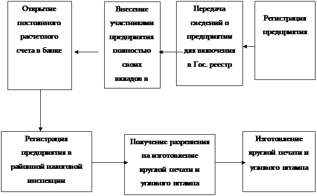 Рисунок 2 – Этапы создания нового предприятия Если предприятие создается как акционерное общество (АО), то его учредителям предстоит также осуществить подписку на акции. При открытой подписке учредители публикуют извещение о предстоящей подписке, где указывают предмет, цели и сроки деятельности будущего АО, состав учредителей и дату проведения учредительной конференции, намечаемый размер уставного фонда, количество и виды акций, их номинальную стоимость, сроки начала и окончания подписки на акции и другие требуемые сведения. Подписавшиеся на акции обязаны до дня созыва учредительной конференции внести не менее 30% их номинальной стоимости. Если все акции распределяются между учредителями, то взнос должен составить не менее 50%. Полностью выкупить акции акционер обязан не позднее года после регистрации акционерного общества. Затем проводится учредительная конференция. В ее задачу входит решение таких вопросов, как: · Создание акционерного общества. · Утверждение устава акционерного общества. · Размер уставного фонда после завершения подписки на акции. · Выбор руководящих органов акционерного общества и др. После успешного завершения учредительной конференции осуществляется регистрация вновь созданного акционерного общества, и оно может начинать функционировать. Но хотелось бы затронуть тему бюрократизма при создании малых предприятий. Отечественный экономист А.П.Потемкин в своем «Открытом письме» сравнивает процедуру государственной регистрации создания предприятия в России с подобной процедурой в Германии. По его подсчетам, чтобы официально получить все разрешительные документы, позволяющие начать бизнес в России, предприятию необходимо потратить 1346 дней. Он называет все бюрократические организации, которые необходимо обойти предпринимателю и указывает предельные сроки преодоления каждой из них. Между тем, создание предприятия в Германии требует преодоления лишь трех процедур: 1) заверение уставных документов у нотариуса (требует один час); 2) открытие счета предприятия в банке (20 минут); 3) регистрация автотранспорта фирмы (40 минут) [17, с. 28]. Итого вся процедура занимает два часа. При этом после первых двух процедур предприниматель, не дожидаясь регистрации своего вновь созданного предприятия в Торгово-промышленной палате Германии, может заниматься любым бизнесом: производством, торговлей, сервисом – всеми видами деятельности, которые не противоречат законам Германии. Автор считает, что подобная процедура показательна для всех стран ЕС и своему процветанию они обязаны в значительной степени простой разрешительной процедуре создания новых предприятий. 2.1 Организационно – правовые формы предприятий малого бизнеса В соответствии с Гражданским кодексом РФ в стране создаются следующие организационно-правовые формы малого бизнеса: · Хозяйственные товарищества. · Хозяйственные общества. · Производственные кооперативы. · Государственные и муниципальные унитарные предприятия. Хозяйственные товарищества могут создаваться в форме полного товарищества и товарищества на вере (коммандитного) [17, с. 97]. Полное товарищество – это товарищество, участники которого заключили между собой договор о создании предприятия для совместного ведения хозяйственной деятельности. Источником формирования имущества по