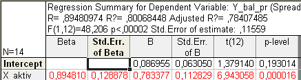 Рис. 2. Результаты регрессионного анализа R = 0,894 – коэффициент множественной корреляции; R? = 0,80068 – коэффициент детерминации модели; AdjustedR? = 0,7840 – скорректированный коэффициент детерминации на число наблюдений и число параметров; F(1,12) = 48.206 – критерий адекватности Фишера; Std.Errorofestimate = 1,11559 – среднее квадратическое отклонение ошибок модели; Beta – стандартизированный коэффициент регрессии; То есть, наша модель имеет следующий вид: Построим график линейной функции с доверительными интервалами. Для этого в меню Graphs/Scatterplits необходимо указать переменные, линию уровня и доверительные интервалы (рис. 3).