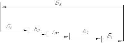 Рисунок 1 - Размерные цепи А, Б, В Строим схему размерной цепи В, точность замыкающего звена которой была рассчитана ранее. Звено В8 – увеличивающее. В1, В2, В3, В4, В5, В6, В7 – уменьшающие Номинальные значения звеньев В1=9мм – фланец крышки; В2=5мм – втулка; В3=30мм – подшипник; В4=10мм – бурт вала; В5=90мм – колесо; В6=30мм – подшипник; В7= фланец крышки; В8=198 – расстояние между торцами корпуса. Выполняем расчёт размерной цепи В различными методами точности. Расчёт РЦ на максимум- минимум. Постановка задачи. Имеется РЦ, состоящая из n составляющих звеньев, причём m из них увеличивающие. Назначить допуски одного или двух соседних квалитетов на составляющие размеры, причём размер замыкающего звена должен находиться в заданном интервале, равном ТБS. Исходя, из условия замкнутости РЦ через замыкающее звено определим его номинальное значение по формуле