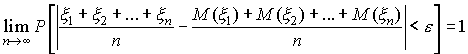 Смысл закона больших чисел Чебышева состоит в следующем. В то время как отдельная случайная величина может принимать значения, очень далекие от своего математического ожидания, средняя арифметическая большого числа случайных величин с вероятностью, близкой к единице, принимает значение, мало отличающееся от среднего арифметического их математических ожиданий. Неравенство Чебышева. Пусть ξ случайная величина с Mξ и Дξ. Тогда для этой случайной величины выполняется неравенство