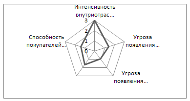 Проведя анализ (Приложение 5), мы выяснили, что давление, оказываемое на предприятие, тремя перечисленными группами покупателей равно – 1,4 балла, оно так же не велико. Дабы оценить общее положение предприятия на рынке, необходимо отразить все силы, оказывающие конкурентное давление, на специальном графике. Для чего необходимо в, начале построить таблицу. Таблица 5Общая оценка воздействия сил конкуренции на «ПС Нива»