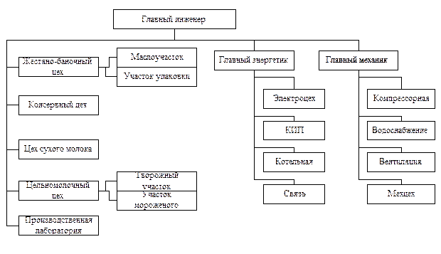 Руководство текущей деятельностью ООО «Молочная компания» осуществляется генеральным директором. Как видно из приведенной структуры предприятия, ему подчинены: - главный инженер, который отвечает за технику безопасности на предприятии, за правильную эксплуатацию оборудования, за соблюдение всех технологических режимов и за качество продукции; - главный бухгалтер, который отвечает за все финансовые операции предприятия, занимается их контролем; - заместитель генерального директора по кадрам и быту, в службе которого находятся отдел кадров, торговый отдел, материально-технические склады (в основном торговые), дом быта, детский сад, медсанчасть, ЖКО, оздоровительно-культурный комплекс; - заместитель генерального директора по снабжению и сбыту, который отвечает за работу отделов снабжения и сбыта, а также за нормальное функционирование всех складов предприятия; - заместитель генерального директора по капитальному строительству, которому подчинены отдел капитального строительства и производственно-технический отдел; - планово-экономический отдел, основной задачей которого является анализ деятельности предприятия и планирование его работы на очередной период; - юридический отдел, который занимается всеми юридическими операциями предприятия, следит за соблюдением законов, постановлений, инструкций, трудовых кодексов и т.д.; - автотранспортный цех, обеспечивающий транспортом все подразделения предприятия; - отдел ценных бумаг, основной задачей которого является работа с ценными бумагами, поступающими на предприятие в счет взаиморасчетов, реализация ценных бумаг, а также работа с собственными ценными бумагами; - отдел по работе с хозяйствами, отвечающий за качество и объемы заготовок основного сырья – молока. Главному инженеру подчинены все главные специалисты: - главный механик, отвечающий за работу механического цеха, ему подвластны механики всех основных цехов. Главный механик отвечает за правильную эксплуатацию основного технического оборудования; - главный энергетик, который решает все вопросы по энергоснабжению, у него в подчинении электроцех, котельный цех; - главный метролог, ответственный за все приборы учета и контроля автоматики питания технического оборудования; - главный технолог, который отвечает за соблюдение всех технологических режимов, решает все технологические проблемы. Ему подчинены цеха основного производства: консервный, цельномолочный, цех сухого молока, производственная лаборатория. Заведующая производственной лабораторией отвечает за качество сырья, ведет контроль за количеством сырья (сахара, какао, жести и т.д.) и в целом отвечает за качество выпускаемой продукции. Рис. 2 Структура производства ООО «Молочная компания»