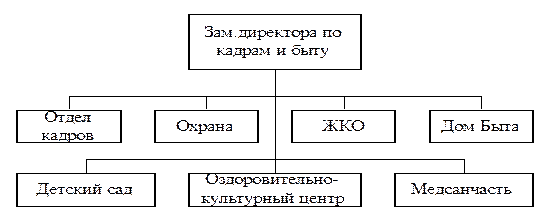 Зам. директора по коммерческим вопросам подчинены: - отдел снабжения, отвечающий за обеспечение предприятия необходимыми сырьем и материалами; - отдел сбыта, отвечающий за сбыт готовой продукции; - материальные склады, обеспечивающие хранение материальных ценностей; - склады готовой продукции; - участок погрузочно-разгрузочных работ. В службу зам директора по кадрам и быту входят отдел кадров, отвечающий за движение кадрового состава на предприятии и ряд подразделений социально-бытового назначения. Рис. 5 Отдел кадров и быта