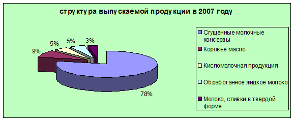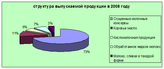 Данные таблицы 3 показывают, что предприятие специализируется на выпуске молочных консервов, в основном производство консервированного сгущенного молока. Хорошее качество, современная упаковка, невысокая цена сделала цельномолочную продукцию предприятия конкурентоспособной. За анализируемые периоды видно, что предприятие отказалось от производства ряда видов продукции, которые занимали в структуре производства не значительную часть и не относились к основному профилю производства, такие как: минеральная вода и хлебобулочные изделия. Увеличение производства обработанного молока произошло в силу введения на предприятии новой технологии розлива. С 2007 года молоко разливают еще и в упаковку «Тетра Пак», которая обеспечивает сроки хранения продукта в течении 72 часов (трех суток). В общем небольшая доля производства обработанного молока объясняется тем фактором, что существующая технология обработки и розлива молока в упаковки «Тетра Пак» и пластиковые пакеты со сроком хранения 48 часов. Данная технология резко сужает географию распространения продукции, как следствие и рынок сбыта, не позволяет ее хранить на складах оптовых компаниях и т.д. За анализируемый период следующие изменения в объемах выпуска по основным видам продукции: · Сгущенные молочные консервы – +80561 тыс. рублей или на 24,6%. При этом в 2007 году рост производства составил 35,6%, а в 2008 году - -8,1% по отношению к предыдущему году или +87154 тыс. рублей и -6584 тыс. рублей в 2007 и 2008 годах соответственно; · Обработанное жидкое молоко – +18233 тыс. рублей (+131,2%), из +6073 тыс. рублей (+43,7%) в 2007 году и 12160 (+87,5%) в 2008 году; · Кисломолочная продукция – +3133 тыс. рублей (+14,3%), из них -2232 тыс. рублей (-10,2%) в 2007 году и +5365 тыс. рублей (24,5%) в 2008 году; · Сухое молоко – 30446 тыс. рублей или -67,8%, из которых -32904 тыс. рублей (-73,3%) пришлось на 2007 год, а +2458 тыс. рублей (+5,5%) пришлось на 2008 год. В 2008 году предприятие освоило еще и ряд новых видов деятельности, которые являются сопутствующими основному производству и занимают крайне не значительную часть в структуре валового выпуска. В целом за прошедшие три года произошло увеличение выпуска продукции на 7,9% в стоимостном выражении. Ниже продемонстрируем наглядно изменение в структуре выпускаемой продукции: