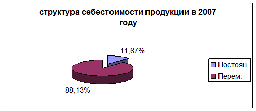 Средняя заработная плата одного рабочего за рассматриваемый период выросла: · Среднегодовая – на 67,5%, из них на 33,8% в 2007 году по отношению к 2006 году; · Среднедневная – на 59,3%, из них на 33,2% в 2007 году по отношению к 2006 году; · Среднечасовая – на 52,7%, из них на 31,7% в 2007 году по отношению к 2006 году. Таким образом, рост заработной платы на предприятии значительно опережал рост производительности труда, не смотря на сокращение штата, увеличение объемов производства и отработанного количества времени. 1.5 Анализ себестоимости продукции На предприятиях планирование и учет себестоимости продукции ведется в разрезе элементов затрат и калькуляционных статей расходов. Необходимость деления калькуляционных расходов на постоянные и переменные имеет большое аналитическое значение, т.к. дает возможность проследить влияние постоянных расходов на уровень себестоимости продукции при изменении объема производства: при росте объема производства продукции сумма постоянных расходов в ее себестоимости снижается обратно пропорционально и наоборот. Переменные расходы в этом случае никакого влияния на себестоимость продукции не оказывают, т.к. в себестоимости единицы продукции они составляют постоянную величину. Таблица 14. Влияние постоянных и переменных расходов на себестоимость продукции при изменении объема производства