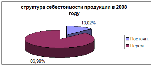 В прошедшие три года предприятие стремилось сокращать постоянные расходы. Их доля в 2006 году составляла 24,72%, в 2007 году – 11,87%, а в 2008 году – 13,02%. Изобразим графически структуру себестоимости продукции по годам: