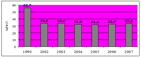 Рис. 2. Валовой надой молока в РФ в хозяйствах всех категорий, млн.т. На 1 января 2008 г. численность КРС по России в хозяйствах всех категорий составила 21,5 млн. голов, в том числе коров – 9,3 млн. голов (99,2%). (рис. 3.). По прогнозу, в 48 территориях численность КРС не только стабилизируется к уровню 2007 года, но по некоторым регионам увеличится.