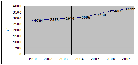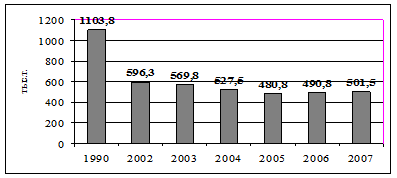 Рис. 5. Валовое производство молока в Самарской области в хозяйствах всех категорий, тыс.т.[14] В то же время в области наблюдается тенденция спада производства молока, которая была остановлена, начиная с 2005 года и по сегодняшний день (рис. 5.). Это связано с небольшим ростом продуктивности и стабилизацией поголовья. Поголовье КРС в области уменьшалось катастрофически высокими темпами.Следует отметить: в 2006 году завершился период сокращения поголовья коров, свиней и овец, а в 2007 году тенденция по увеличению поголовья всех видов скота укрепилась (рис. 6.). Сельскохозяйственные организации области за 2006 год на полученные кредитные средства закупили 892 головы племенного скота КРС, 1650 свиней и 196 овец.