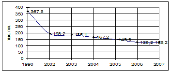 Рис. 6. Поголовье коров в Самарской области в хозяйствах всех категорий, тыс. гол.[15] Поголовье КРС во всех категориях хозяйств на 1 января 2007 года составило 245,9 тыс. голов (-6,8%), в том числе коров - 128,2 тыс. голов (100% от уровня 2006 года). За 2007 год поголовье КРС во всех категориях хозяйств достигло 253,9 тыс. голов (+1,6% к началу года), в том числе коров - 125,6 тыс. голов (-2% к началу года). Если рассматривать среднегодовую продуктивность коров по Самарской области, можно сказать, что в отдельно взятом регионе наблюдаются схожие с общероссийскими тенденции, однако надои значительно ниже среднего показателя по РФ (рис. 7.).