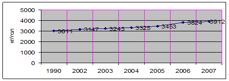 Рис. 4. Среднегодовой удой на 1 корову в РФ в сельскохозяйственных организациях, кг Пока достигнутый рост молочной продуктивности коров во многих субъектах не компенсирует снижение производства продукции, связанное с сокращением поголовья коров (около 1 млн. тонн молока). В ближайшие годы для увеличения запланированного производства молока необходимо не только стабилизация поголовья коров, но и увеличения их численности не менее чем на 400-500 тыс. голов. В то же время, даже после сокращения численности коров к уровню 1990 года почти в 2 раза, в России на 1 тыс. человек приходится по 66 коров - больше, чем в других передовых странах, в то время как в США - 40, Англии - 44, Канаде - 41 корова, в странах ЕС - 45-48. При этом средний надой молока на корову у нас в 2-3 раза ниже. В заключение общей характеристики отрасли молочного скотоводства необходимо рассмотреть экономические показатели производства молока в России (табл. 1.4.). Таблица 1.4. Экономические показатели производства молока в РФ в сельскохозяйственных организациях