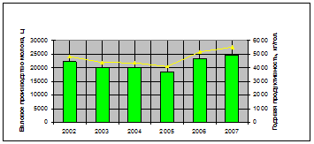 Анализируя данные таблицы 2.8., можно сделать вывод, что в целом численность поголовья в хозяйстве оставалась стабильной, что связано, прежде всего, с грамотной ветеринарной и племенной работой в хозяйстве, в результате которой сводится к минимуму выбраковка в дойном стаде, а выбракованный скот вовремя заменяется ремонтными телочками. Рассматривая данные о валовом производстве молока, нельзя не заметить огромный шаг вперед, сделанный в последние 2 года отчетного периода. Особенно велик рост по сравнению с 2005 годом (+25,2 и +34,1% соответственно), характеризующимся самым низким показателем валовой продукции молочного стада в связи с наименьшей за исследуемый период продуктивностью коров.