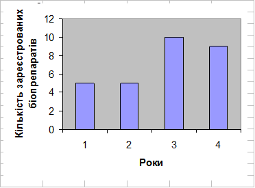 1.4 Сучасна ситуація із застосуванням біопрепаратів у рослинництві Сьогодні в Україні зареєстровано близько десяти біопрепаратів, а саме: – фунгіцид Агат-25 К, т.п. (інактивовані бактерії Pseudomonasaureofaciens Н 16 – 2%, біологічно активні речовини культуральної рідини – 38%); – інсектицид Актофіт, 0,2% к.е. (аверсектин); – полі функціональний препарат Азотофіт, к.с. (суспензия несимбиотических вільноживущих азотфиксирующих бактерій Azotobactercrhoococcum), препарат є протруювачем насіння, оскільки має чітко виражену фунгіцидну дію та частково замінює азотні добрива; – Бактофіл марки А, р. (Azopirilusbrasilense, Azotobactervinelandi, Bacillusmegaterium, Bacilluspolymyxa,Pseudomonasfluorescens, Streptomycesalbus – 3x108 клітин/мл); – Бактофіл марки Б, р. (Azospirilumlipoferum, Azotobactervinelandi, Bacillusmegaterium, Bacillus circulans, Bacillus subtilis, Pseudomonasfluorescens, Micrococcus roseus – 3x108 клітин/мл); – інсектицид Вірін НШ, р. (поліедри вірусу ядерного поліедрозу непарного шовкопряда, 0,5%); – інсектицид Вірін Діпріон, р. (поліедри вірусу ядерного поліедрозу рудого соснового пильщика, 0,5%); – інсектицид Вірін-ЗСП, р. (поліедри вірусу ядерного поліедрозу звичайного соснового пильщика, 0,5%); – фунгіцид Сімтес, в.р. (лужний екстракт плодових тіл афілофоральних грибів і соку борщевика Сосновського та ВАС, ТУ У30721813-001-2001); – фунгіцид Фітоцид (суміш живих клітин та спор Bacillussubtilis). Багато це чи мало, і чи достатньо? Проведемо невеличкий аналіз. Візьмемо кількість зареєстрованих препаратів за різні періоди. Результати досить показові (рис.1.1). У 2001 році тимчасову реєстрацію мали лише п’ять продуктів, а саме: Вірін-Діпріон, р., Вірін-ЗСП 0,3-0,5% р., Вірін-НШ 0,3-0,5% р., Клепс, п. (бактерії KlebsiellaoxytocaBH-13 титр 1012 куо/г, та Bacillus mucilaginosus B-4901 титр 106-8 куо/г) та Фітоверм, 0,2% к.е. (аверсектин). Майже всі вони (крім Клепса) мали експериментальну реєстрацію. Станом на 2003 рік ситуація змінилася, але зміни ці стосувалися лише асортименту біопрепаратів, кількість залишилася незмінною – 5 препаратів і всі вони були зареєстровані тимчасово. На той період дозволені для використання біопрепарати представляли Агат 25К, т.п. (Pseudomonasaureofaciens Н 16), Актофіт, 0,2% к.е. (аналог Фітоверму), Клепс, п., Мікосан (марок Н та В), 3% в.р.к. (лужний екстракт афілофорального гриба Fomasfomentanus, хітозан) та препарат Сімтес, в.р (лужний екстракт плодових тіл афілофоральних грибів і соку борщевика Сосновського та ВАС).