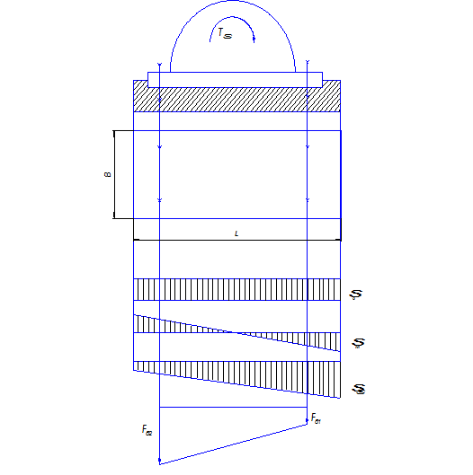 Министерство образования и науки Украины Харьковский национальный аэрокосмический университет им.Н.Е.Жуковского “ХАИ” Кафедра 202 “Привод аэросаней” ХАИ.202.234.07З.260.16 Пояснительная записка к курсовому проекту по дисциплине “ Конструкция машин и механизмов ” Выполнил: студентка гр.234 Сабадаш Ю.Н. Проверил: доц. Назин В.И. Харьков 2007 Содержание Введение 1Определение исходных данных 2.Подбор электродвигателя 3.Расчет цилиндрической косозубой передачи 3.1 Расчет первой ступени 3.2 Расчет второй ступени 4.Подбор муфт 5. Расчет валов 5.1 Расчет диаметров валов 5.2 Проверочный расчет быстроходного вала 5.3 Проверочный расчет среднего вала 5.4 Проверочный расчет приводного вала 6. Расчет подшипников по динамической грузоподъемности 6.1 Расчет подшипников быстроходного вала 6.2 Расчет подшипников среднего вала 6.3 Расчет подшипников приводного вала 7.Расчет параметров корпуса 8.Подбор масла 9.Расчет фундаментальных болтов 10. Расчет узла винта Список используемой литературы Введение Редуктором называют механизм, выполненный в виде отдельного агрегата, служащий для понижения угловой скорости и соответственно повышения крутящих моментов. Редуктор — неотъемлемая составная часть современного оборудования. В приводах общемашиностроительного назначения, разрабатываемых при курсовом проектировании, редуктор является основным и наиболее трудоемким узлом. Цилиндрические двухступенчатые редукторы развернутой схемы применяются обычно в интервале передаточных чисел 8..30. Простота конструкции обусловила их широкое применение в промышленности. Заданием курсового проекта является расчет и проектирование основных узлов редуктора аэросаней: расчет на прочность и выносливость шестерни и зубчатых колес, подбор и расчет основных узлов, валов и подбор подшипников, проектирование узла редуктора с двигателем и барабаном в сборе. Проектируемый в данной работе редуктор аэросаней должен отвечать основным критериям работоспособности: прочности, износостойкость, жесткости, теплостойкости, вибрационной устойчивости. Значение того или иного критерия определяют по условиям работы. Основным требованием, предъявляемым к конструкции проектируемого механизма, является надежность и экономичность. 1.Определение исходных данных редуктор подшипник вал болт 1.1 Потребная мощность привода Pвх=18,4 кВт; ηобщ=ηзп2ηмуф2ηподш4 ; ηмуф=0,96..0,98; ηподш=0,99..0,995; ηзп=0,96..0,98; ηобщ=0,982 ·0,9952·0,97=0,886; 1.2 Передаточное отношение редуктора iобщ= Принимаем i1=3,2, отсюда i2=iобщ/i1=2,95; 1.3 Частота вращения среднего вала n2= 1.4 Частота вращения тихоходного вала n3= 1.5 Крутящий момент на приводном валу T1= 1.6 Крутящий момент на среднем валу T2= 1.7 Крутящий момент на быстроходном валу. T3= 2. Подбор электродвигателя nдв=8500 мин-1 -номинальные обороты двигателя Nдв=18,4 кВт -мощность номинальная Двигатель Хонда – 250РС, Япония 3. Расчет цилиндрической прямозубой передачи 3.1 Расчет первой ступени. Подводимая к валу шестерни мощность -------------------18,4 кВт Срок службы------------------------------------------------------9000 ч Частота вращения шестерни-----------------------------------n1=8500 мин-1 Частота вращения колеса---------------------------------------n2=2656,26 мин-1 Угол наклона зуба в зацеплении------------------------------b=0° Угол зацепления--------------------------------------------------a»20° Режим нагрузки постоянный. Принятые материалы