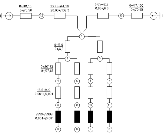Рисунок 3 – Схема замещения с нанесенными параметрами Исходные данные для расчетов токов КЗ в программе TKZ 3000 представлены в приложение Б. Результаты расчетов токов коротких замыканий приведены в приложении В. 4 Выбор электрооборудования 4.1 Расчет токов в цепях трансформатора Ток нормального режима на стороне высшего напряжения, А