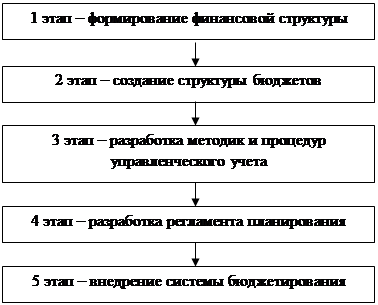 Рисунок 1 - Этапы постановки системы бюджетирования Цель первого этапа (формирование финансовой структуры) – разработать модель структуры, позволяющей установить ответственность за исполнение бюджетов и контролировать источники возникновения доходов и расходов. На втором этапе (создание структуры бюджетов) определяется общая схема формирования сводного бюджета предприятия. В результате проведения третьего этапа формируется учетно-финансовая политика организации, то есть правила ведения и консолидации бухгалтерского, производственного и оперативного учета в соответствии с ограничениями, принятыми при составлении и контроле (мониторинге) выполнения бюджетов Четвертый этап направлен на разработку регламента планирования, определяющего процедуры планирования, мониторинга и анализа причин не выполнения бюджетов, а также текущей корректировки бюджетов. Пятый этап (внедрение системы бюджетирования) включает работы по составлению операционного и финансового бюджетов на планируемый период, проведению сценарного анализа, корректировке системы бюджетирования по результатам анализа ее соответствия потребностям. Функции бюджета: · планирование операций, обеспечивающих достижение целей организации; · координация различных видов деятельности и отдельных подразделений, согласование интересов отдельных работников и групп в целом по организации; · стимулирование руководителей всех рангов в достижении целей своих центров ответственности; · контроль текущей деятельности, обеспечение плановой дисциплины; · оценка; · обучение. Подробно рассмотрим каждую из перечисленных функций. Планирование. Основные плановые решения обычно вырабатываются в процессе подготовки программ, и сам процесс разработки бюджета по существу является уточнением этих планов. Разработка бюджетов по существу является самым детализированным видом планирования, уточняющим основные операции по отдельным подразделениям или функциям компании на ближайший период. [4] Координация и связь. В процессе разработки бюджета координируются отдельные виды деятельности таким образом, чтобы все подразделения организации работали согласованно, воплощая цели организации в целом. Очень важно, чтобы планы производства были скоординированы с планом отдела маркетинга, т.е. необходимо произвести количество продукции в соответствии с запланированным объемом продаж и желаемым уровнем конечных запасов готовой продукции. Планы руководства не будут осуществлены, пока все исполнители не поймут содержание этих планов. Утвержденный бюджет является наиболее важным инструментом для увязки количественной информации в этих планах и имеющихся ограничений. [9] Стимулирование. Процесс составления бюджета может быть также мощным средством для стимулирования руководителей в осуществлении целей их центров ответственности и, следовательно, целей организации в целом. Стимулирующая роль бюджета проявляется еще больше, если менеджеры принимают активное участие в разработке бюджета своего подразделения. Контроль. Бюджет представляет собой отчет о желаемых результатах на момент формирования бюджета. Тщательно подготовленный бюджет является наилучшим стандартом, с которым сравнивают фактически достигнутые результаты, так как он включает оценку эффекта всех переме