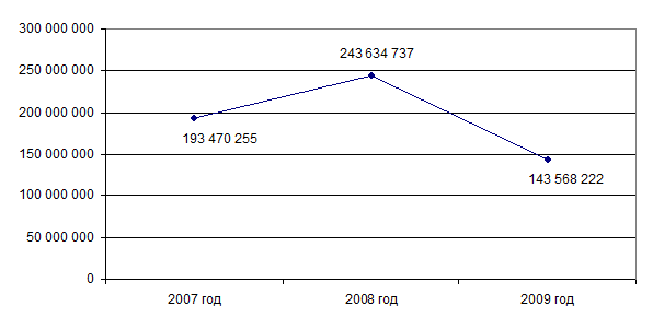 Затраты на сырье и топливно-энергетические ресурсы являются основными составляющими себестоимости продукции. За рассматриваемый период их доля колеблется от 68% до 77,2%. Рис. 2.3 График чистой прибыли за 2007-2009 год (тыс.руб.)