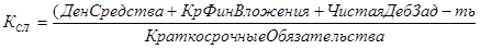 Этот коэффициент показывает, достаточно ли у предприятия средств, которые могут быть использованы для погашения его краткосрочных обязательств в течение определенного периода. 11. Коэффициент срочной ликвидности :