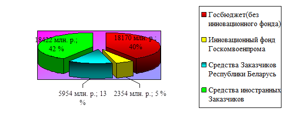 Из общего объема выпуска продукции, выполненных работ и услуг в 2009 г. 66,3 % занимают научно-исследовательские и опытно-конструкторские работы и научно-технические услуги – основной вид деятельности предприятия. Не основные виды деятельности занимают 33,7 % от общего объема. Это изготовление промышленной продукции и выполнение работ промышленного характера (28,7 %), прочие работы и услуги (2,0 %), услуги автостоянки, общежития-гостиницы, оздоровительного лагеря и сдачи помещений в аренду (3,0 %). В 2009 г. объём выпуска продукции, работ, услуг составил 44 900 млн. р., темп роста к выполнению за 2008 г. составил 104,6 %. Однако за первый квартал, первое полугодие и девять месяцев 2009 г. объём был ниже соответствующего периода прошлого года и темп роста составил соответственно 36,7 %, 83,8 %, 85,5 %. Это объясняется тем, что в первом-третьем кварталах 2009 г. были завершены работы по отдельным ОКР, а также по этапам некоторых экспортных контрактов. Перечень работ, выполняемых в 2010 г., представлен в таблице 2.2. Таблица 2.2 − Программа выполнения работ в УП «НИИСА» на 2010 г., млн. р.