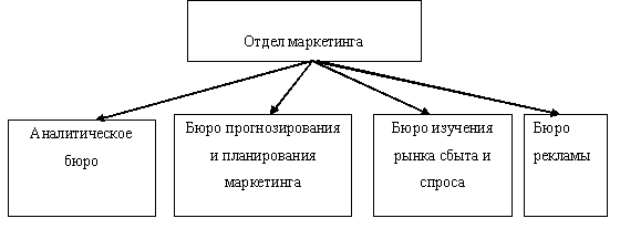 Рисунок 3.1 – Предлагаемая структура отдела маркетинга Рассмотрим подробнее предложенную структуру, а также функции бюро, функциональные обязанности сотрудников и связь с другими подразделениями компании. Основные принципы, которые предлагается заложить при создании отдела маркетинга, следующие: отдел маркетинга организуется в виде самостоятельного подразделения; отдел маркетинга имеет в своем составе бюро, которые планируют, организуют и контролируют выполнение определенных маркетинговых функций предприятия; отдел маркетинга подчиняется заместителю директора по коммерческим вопросам. Начальник отдела маркетинга руководит отделом маркетинга на предприятии, организует и управляет всей деятельностью предприятия в сфере маркетинга, рекламы и стимулирования сбыта. Ему напрямую подчинены руководители бюро отдела маркетинга. Бюро прогнозирования и планирования маркетинга отвечает за текущее планирование маркетинговой деятельности предприятия. Основными задачами являются: разработка прогнозов конъюнктуры рынка, платежеспособного спроса, перспектив развития предприятия, номенклатуры продукции, планируемой к постановке на производство, и цен; выработка рекомендаций по формированию производственных мощностей и плана производства. Сюда входят специалисты по планированию и прогнозированию маркетинга. Специалисты этого бюро осуществляют контроль выполнения маркетинговых функций подразделениями предприятия, которые структурно не входят в состав отдела маркетинга. На них же возложена задача периодической ревизии организации системы маркетинговой деятельности на предприятии. Бюро изучения рынка сбыта и спроса отвечает за планирование, организацию, сбор информации и обработку результатов маркетинговых исследований, проводимых отделом маркетинга. При этом сферой исследований может выступать любой элемент как внешней, так и внутренней маркетинговой среды предприятия. Бюро изучения рынка и спроса включает следующих специалистов: специалисты по экономической информации и по автоматизированной обработке информации; специалисты анализа и прогнозирования спроса и сбыта. При необходимости, специалисты данного бюро могут привлекать внешние ресурсы (компании) к проведению маркетинговых исследований. Аналитическое бюро осуществляет анализ экономических показателей деятельности предприятия. При этом в задачу бюро не входят задачи финансового анализа и планирования деятельности. Аналитическое бюро включит специалистов по анализу внешней и внутренней среды предприятия. Специалисты этого бюро определяют ценовую политику компании, политику скидок, составляют прайс-листы компании. Бюро рекламы предназначено для планирования, организации и контроля рекламной деятельности предприятия, деятельности в области продвижения товаров и стимулирования сбыта. Бюро рекламы включает специалиста по основным формам и средствам рекламы и по ассигнованиям на рекламу. На это же бюро возлагаются обязанности по поддержанию общественных связей компании; организация участия предприятия в центральных и региональных отраслевых выставках, ярмарках, продажах; подготовка необходимых документов и материалов; обеспечение фирменного оформления рекламных материалов и инструментария исследований рынка и спроса населени