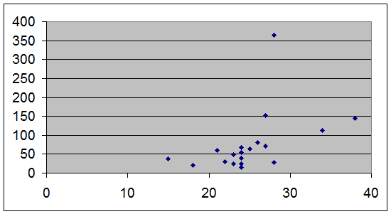 Рис. 12. Корреляционная связь между уровнем КФК (ЕД/л, ось Y) и количеством перфораций (ось Х) у больных с сочетанными операциями. Коэффициент корреляции r=0.15