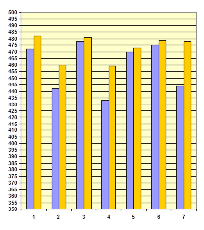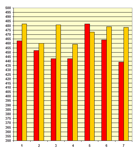 X – нумерация детей в соответствии с номером в таблицах контрольной и формирующей групп; Y - количество баллов; Красный – результаты формирующей группы на контрольном этапе эксперимента; Желтый – результаты контрольной группы на контрольном этапе эксперимента. |