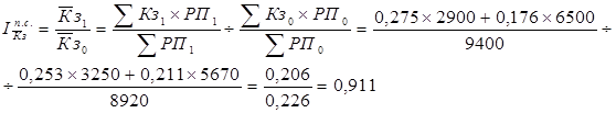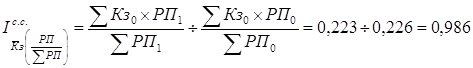 Данный показатель характеризует уменьшение оборотных средств в отчетном году по сравнению с базисным годом на 8,5% в результате изменения доли (удельного веса) реализованной продукции в каждом предприятии в общем объеме реализованной продукции.