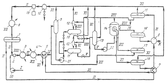 Рис. Принципиальная технологическая схема установки депарафинизации в растворе пропана: 1-сборник жидкого пропана; 2- смеситель; 3- паровой подогреватель; 4, 8- холодильники; 5-7 - теплообменники; 9- промежуточная емкость для раствора сырья; 10, 11 - пропановые кристаллизаторы самоохлаждення периодического действия, работающие попеременно; 12-каплеотоойникн; 13 - приемник суспензии петролатума; 14-барабанный фильтр, работающий под давлением; 15-ёмкость для охлажденного пропана; 16- приемник суспензии петролатума; 17-приемник пропана от промывки осадка на фильтрах; 15-приемник раствора депарафинированного масла; 19-компрессор; 20-22- насосы. Линии: I-сырье; II-пропан; III-раствор сырья; IV-охлажденный раствор сырья; V-суспензия петролатума; VI-раствор депарафинированного масла на регенерацию растворителя; VII — раствор от промывки осадка на фильтрах; VIII- охлажденный пропан на разбавление лепешки петролатума и на промывку лепешки на фильтрах, на разбавление охлажденного раствора, на добавку к сырьевому раствору для компенсации убыли его при самоохлаждении; IX-суспензия петролатума после фильтра; X- раствор петролатума на регенерацию растворителя; XI- пары пропана на компрессию; XII- вода; XIII-водяной пар. Сырье I подается насосом 20 в диафрагмовый смеситель 2, где смешивается со сжиженным пропаном II, поступающим из сборника 1 (рис. 62). Смесь подвергается термической обработке в паровом нагревателе 3 до 50—70 °C, а затем раствор III охлаждается водой в холодильнике 4 до 35-40 °С. Дополнительно раствор охлаждается холодным фильтратом VI в теплообменнике 5. Охлажденный раствор IV поступает в промежуточную емкость 9, откуда насосом 21 подается в один из попеременно действующих кристаллизаторов 10 и II, где за счет снижения давления происходит испарение пропана VIII, подаваемого в кристаллизатор из сборника 15 через теплообменник (на схеме не показаны) непосредственно в раствор, охлажденный до минус 30 - минус 45 °С. В сборнике 15 пропан охлаждается в результате испарения части его. Суспензия V собирается в приемнике 13 и далее насосом 22 подается в барабанные фильтры 14, работающие под избыточным давлением-25—50 кПа (0,25—0,50 кгс/см2 ). Раствор депарафинированного масла VI поступает в приемник 18, откуда, пройдя теплообменники 7 и 5, направляется в секцию регенерации растворителя. Раствор от промывки осадка VII собирается в приемник 17 и затем добавляется к охлаждаемому раствору сырья IV перед кристаллизаторами 10 и 11. Осадок на фильтре промывается Охлажденным пропаном VIII, поступающим из сборника 15. Кроме того, пропан добавляется к петролатуму для разжижения осадка, облегчения транспортирования его шнеком и подачи в приемник 16, откуда через теплообменник 6 раствор петролатума X поступает в регенерационную часть установки. Осадок с барабана фильтра отдувается циркулирующим газообразным пропаном, подаваемым газодувкой. Пары пропана XI, пройдя брызгоотделитель 12, отсасываются компрессором 19, охлаждаются в холодильнике 8 и. поступают в сборник жидкого пропана 1. Основная масса пропана как из раствора депарафннированного масла VI, так и из раствора петролатума X, отгоняется под давлением 1,5—1,7 МПа в паровых испарителях, аналогичных используемым на установках деасфальтизации масел. Остатки пропана удаляют в отпарных колоннах, работающих под давлением, близким к атмосферному. Из отпарных колонн смес
